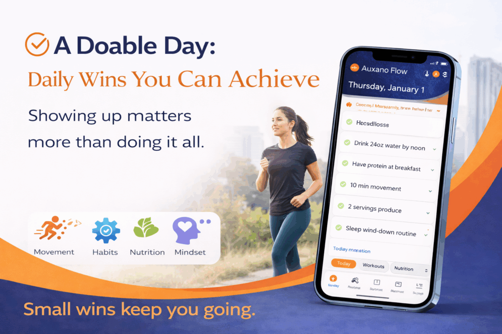 A smart fitness system doesn’t punish you for missed days — it welcomes you back. It removes the mental friction of “starting over” and replaces it with a simple next step. That’s the approach behind Auxano Flow.